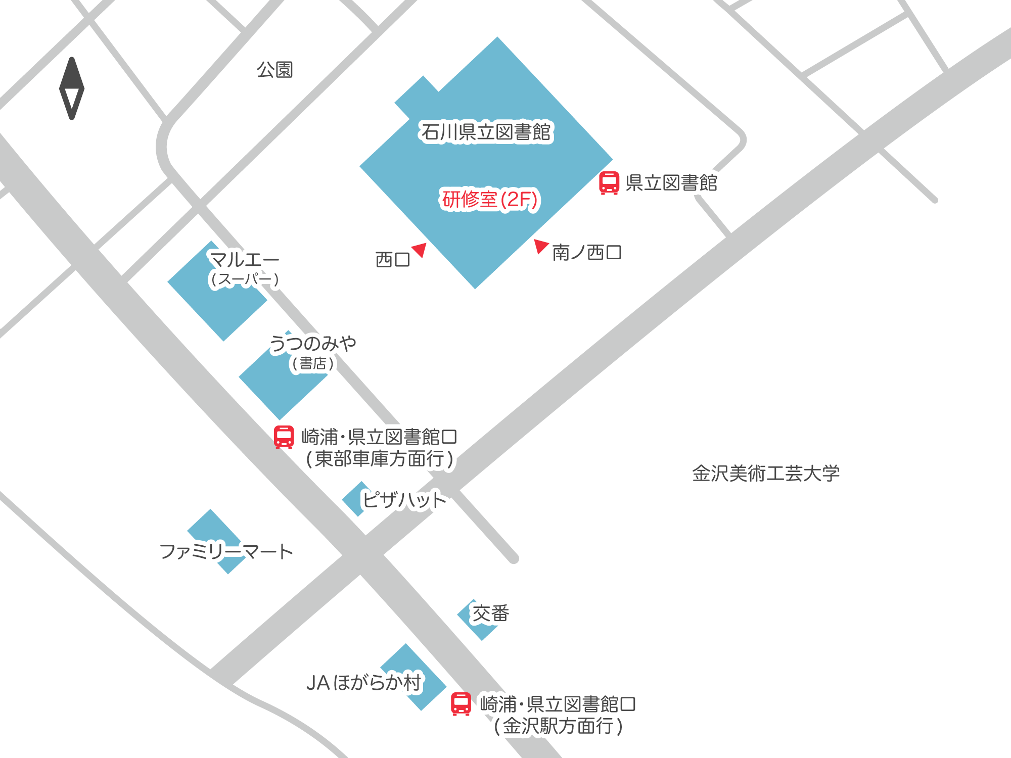 北陸Ruby会議01は、石川県立図書館にて開催いたします。石川県立図書館は金沢駅や金沢市中心部からやや離れた場所に位置しているため、バスでのアクセスをおすすめします。