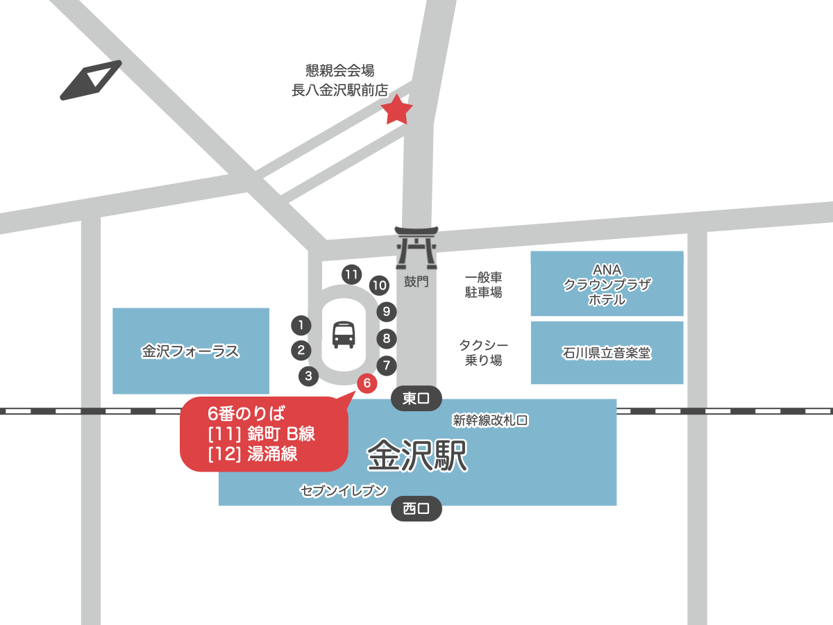 金沢駅の東口(鼓門のある出口・新幹線改札に近い出口)のバスターミナルの6番のりばから、11番または12番のバスで石川県立図書館にアクセスできます。